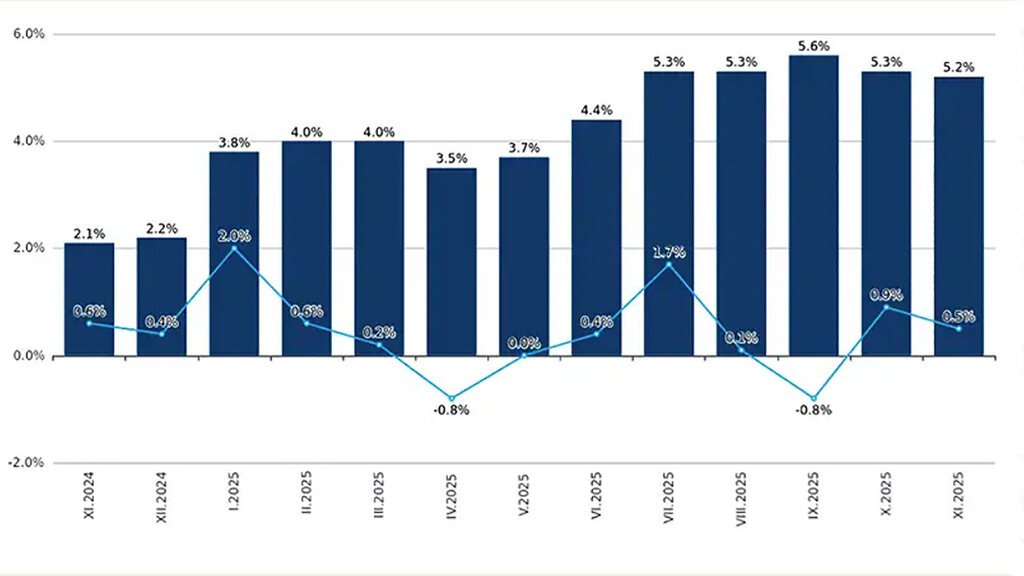 Месечната инфлация за ноември спрямо октомври т.г. е 0.5%, а годишната инфлация за ноември 2025 г. спрямо ноември 2024 г. е 5.2%, съобщи НСИ.