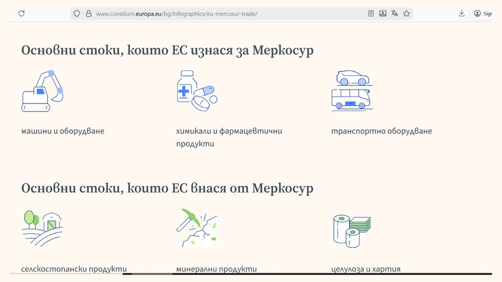 Земеделието в рамките на споразумението за свободна търговия между ЕС и Южна Америка е едва 6%. Това, от което животновъдите най-много се опасяват – телешкото месо, представлява около 1,2% – обясни за БНР евродепутатът Илия Лазаров, член на комисията по външна търговия, за договореното споразумение между ЕС и МЕРКОСУР, което ще бъде официално подписано на 17 януари. Украйна произвежда 5-6 пъти повече жито от Южна Америка, посочи друг аргумент той и допълни, че компенсациите, които се предвиждат за европейските земеделци са достатъчни.