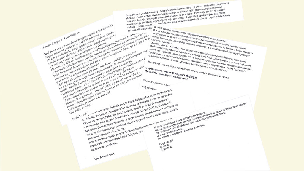 «От всей души поздравляю Вас с прекрасным 90-летним юбилеем! Вот уже как девять десятилетий вы несете слушателям по всей нашей планете самую интересную, актуальную и свежую информацию о Болгарии на 10 языках, а Ваши передачи всегда отличаются разнообразием тем, глубиной, и особой теплотой, которую чувствует каждый слушатель! Желаю русской, и всем другим редакциям «Радио Болгарии» дальнейшего процветания, стабильности и уверенного движения вперед, чтоб Ваша радиостанция и дальше еще много, много лет радовала своих слушателей по всему миру своими новыми передачами и яркими проектами, и встречала еще не один славный юбилей, а сотрудникам «Радио Болгария» - профессиональных успехов, здоровья, благополучия и личного счастья! Ведь 90 лет - это не итог, а прекрасное начало новой страницы в истории! С праздником, «Радио Болгария»! Пусть Ваш голос звучит еще громче!», - пожелал постоянный слушатель Русской службы «Радио Болгария» Андрей Новгородский из Харькова (Украина).