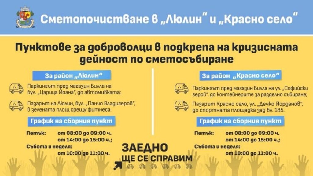 Столичната община организира пунктове за доброволци заради кризата с боклука в районите "Люлин" и "Красно село". Сутринта граждани получиха ръкавици и чували, за да помагат в сметосъбирането.