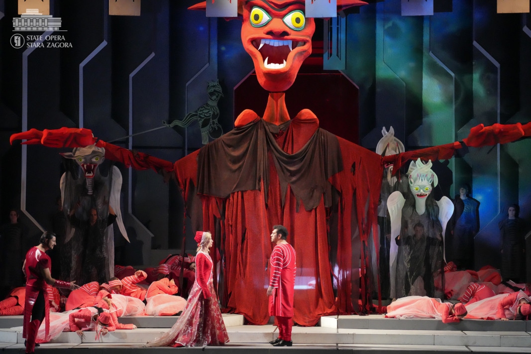В ателиетата на Държавния куклен театър-Стара Загора са изработени 4 кукли-ангели, 4 – кукли дяволи, 6 маски и един огромен Мефистофел – в разгърнато състояние 10 на 7 метра по проект на проф. Васил Рокоманов и Силва Бъчварова. В ателиетата на Старозагорската опера оживя монументалния декор, както и бяха сътворени над 160 костюма, шапки, аксесоари и реквизит. В постановката, която обединява работата на два екипа – оперния и кукления, участват солисти, хор, балет и оркестър, Детско-юношеска студия за опера и балет на Държавна опера-Стара Загора, артисти от Държавния куклен театър-Стара Загора, представители на Прабългарската школа за оцеляване „Бага-Тур”.