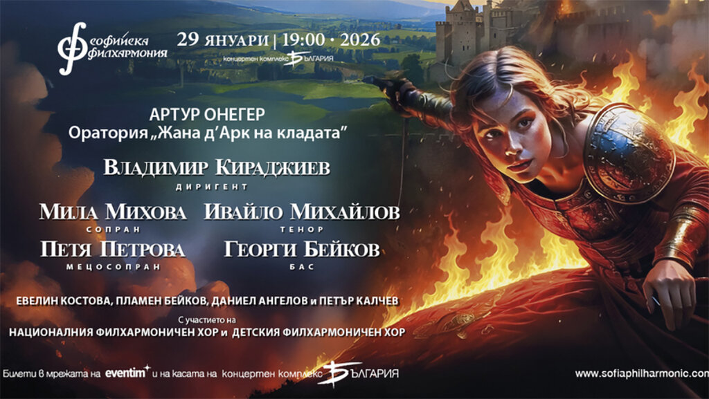 Sofya Filarmoni Orkestrası, tarihinde ilk kez 29 Ocak 2026'da başkentteki “Bulgaria” Salonunda, 20. yüzyılın en etkileyici vokal – senfonik yapıtlarından biri olan Arthur Honegger'in bestelediği ve Paul Claudel'in yazdığı “Jeanne d'Arc'ın yakılması”(Jeanne d'Arc au bûcher) oratoryosunu seslendirecek.
