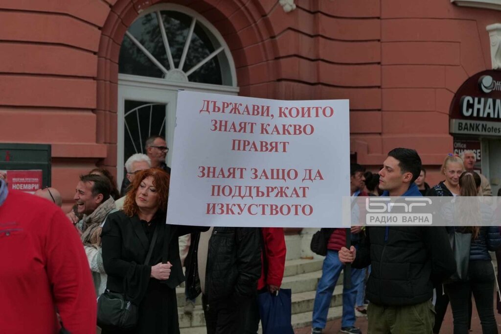 Артисти от Драматичен театър „Стоян Бъчваров“, Варненската опера и Кукления театър протестират пред входа на театъра.