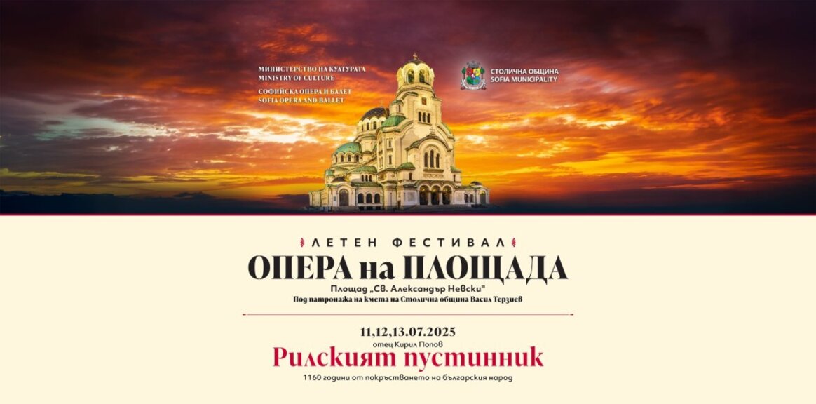 През месец юли пред храм-паметника "Св. Александър Невски" в продължение на три вечери – на 11, 12 и 13 юли, от 9 часа вечерта ще се играе операта "Рилският пустинник" по музика на отец Кирил Попов. Спектакълът е посветен на 1 160-та годишнина от покръстването на българския народ, разказа директорът на Софийската опера и балет акад. Пламен Карталов, който е и режисьор на спектакъла: