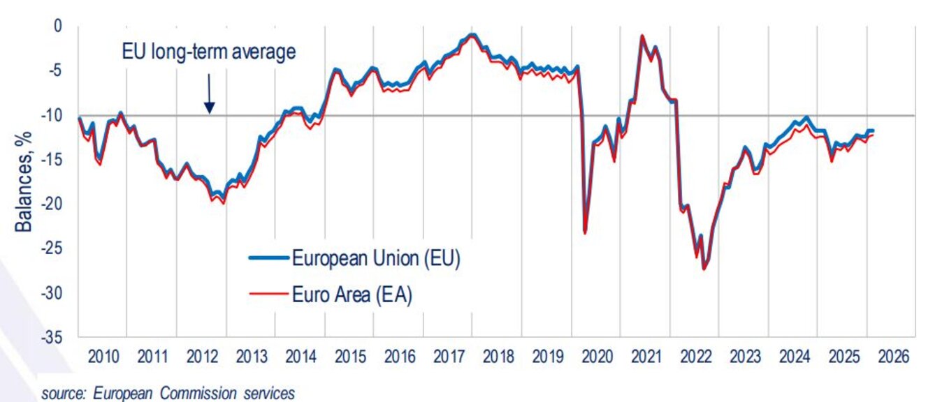 Индексът на потребителското доверие в еврозоната се повиши с 0,2 пункта до -12,2 пункта от -12,4 пункта през януари 2026 г. Това е най-високото му ниво от ноември 2024 г.