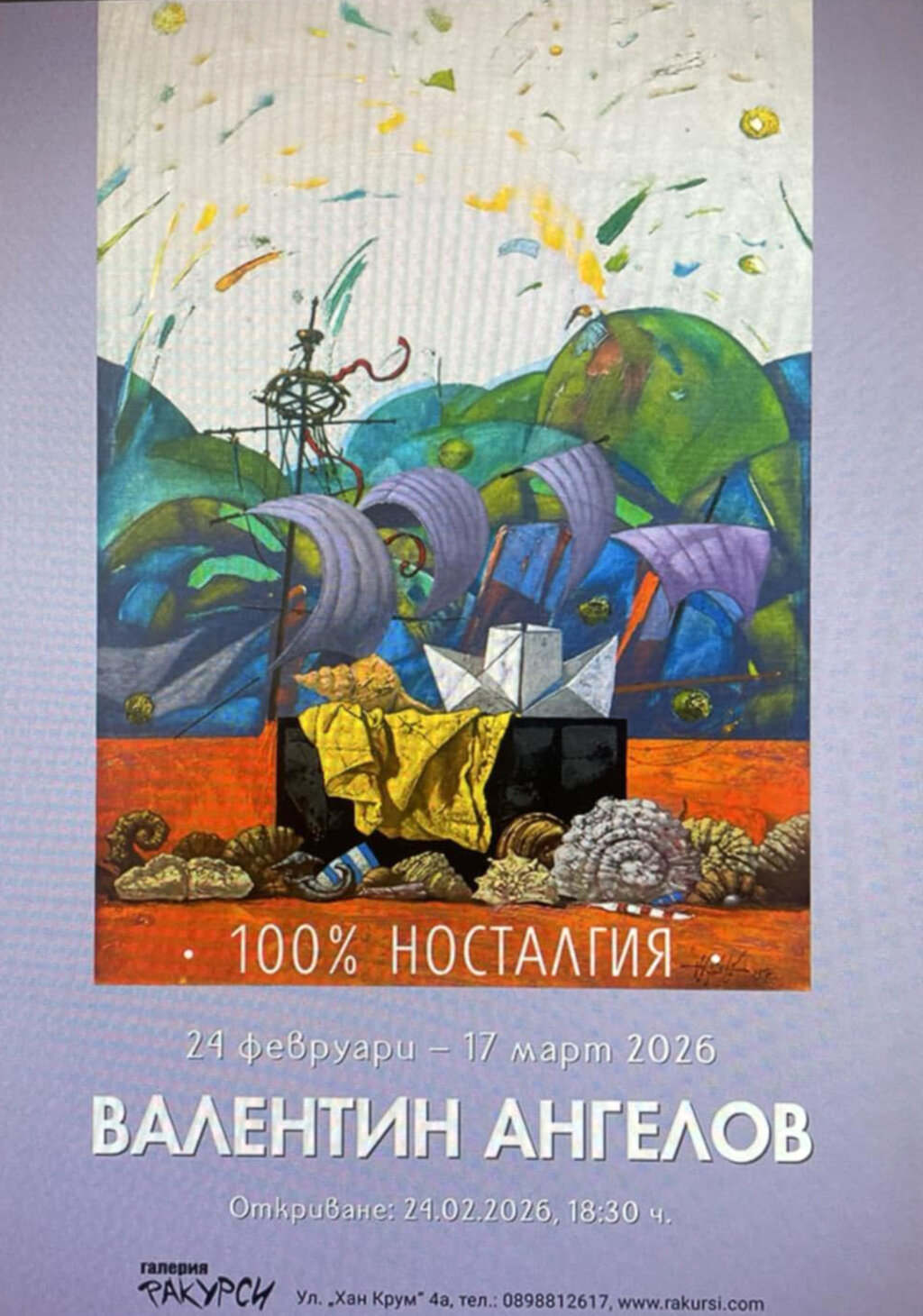 В столичната галерия "Ракурси" художникът Валентин Ангелов представя новата си изложба – "100% носталгия". Експозицията ще бъде открита утре, на 24 февруари, и може да бъде разгледана до 17 март.